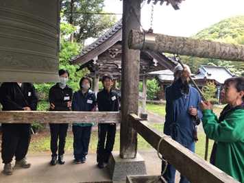 梵鐘を撞く塾生 早朝の静寂に響く梵鐘(規則正しく撞き、お題目を唱えます。)緊張していますが、すがすがしい!